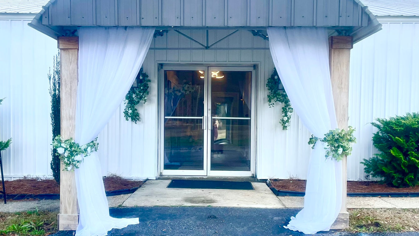 Elevate your wedding day with a professionally styled venue entrance. Our Total Decorating Package includes full-service setup of floral displays on the entrance columns. Creating a light and airy feeling with elegant fabric draping. All this providing a seamless wedding decor experience that saves you time and ensures a cohesive aesthetic from the first step inside.